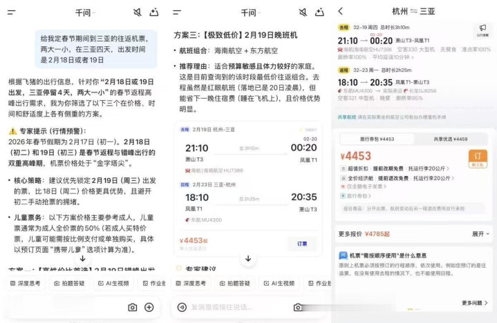更复杂一些的操作也可以,比如像聊天一样说“想给爸妈家买个扫地机器人,预算2000到4000,家里还有只猫”,千问App就能推理出“防缠绕”、“高温杀菌”的需求,并给出合适的商品;准备春节出游,千问App一边调用飞猪来预定机票和酒店,一边调用高德来做行程规划和预定年夜饭,甚至直接打电话订餐厅。
