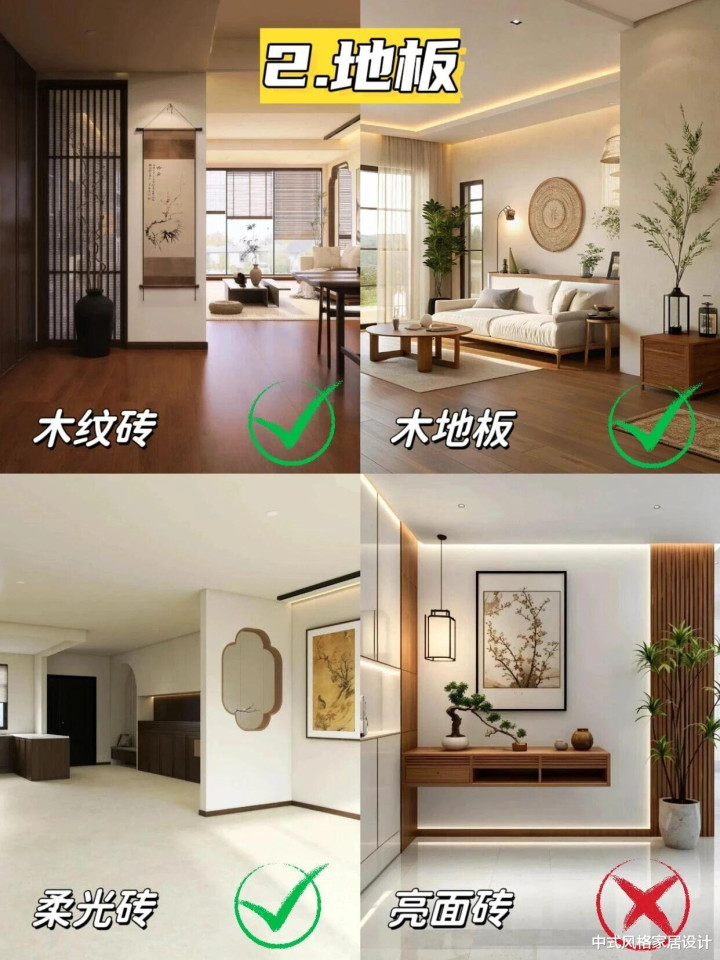 二、地板:装哑光水墨砖/深木纹,不装亮面大理石