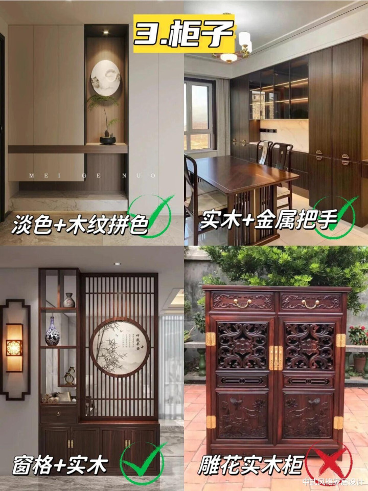 新中式的柜体,应是静谧的背景而非喧闹的主体。推荐采用平板柜门搭配内嵌式拉手(如古铜条),线条干净利落。柜体顶部预留30公分左右的空档,既避免了顶天立地的压迫感,视觉上也能拉高层高,使柜体宛若一面装饰墙。务必远离通体镂空雕花的柜子,不仅难以清洁,过于密集的图案也会带来视觉焦虑,破坏了中式美学中“疏可跑马”的意境。