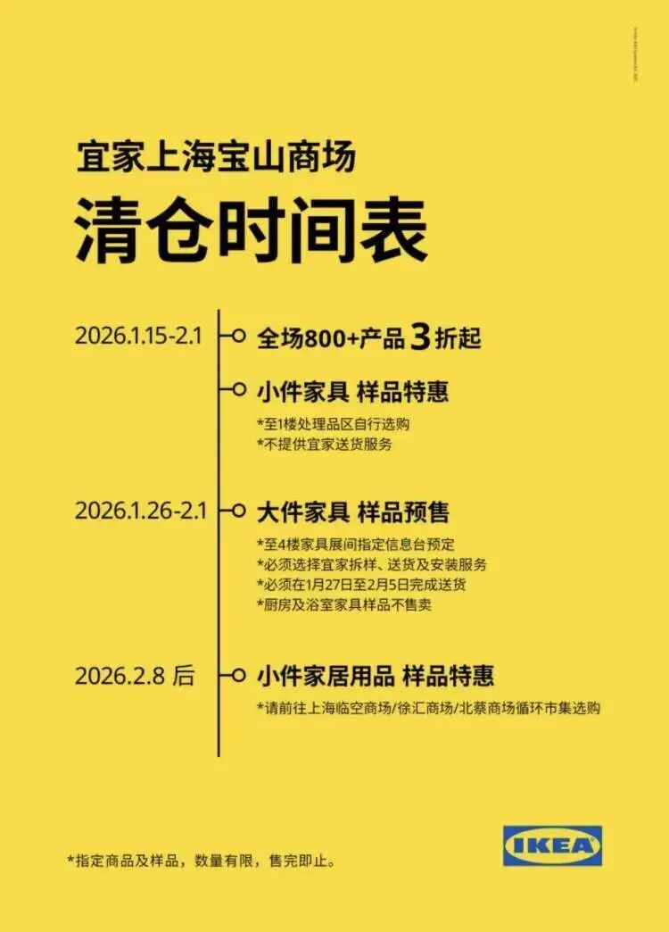 另外,宝山宜家将在1月15日至2月1日开启清仓特惠活动,官方公布的“清仓时间表”显示届时全场有800+产品3折起。记者就具体有哪些产品打折询问了商场工作人员,对方表示:“目前没有相关信息,可以15日当天到店来看。”