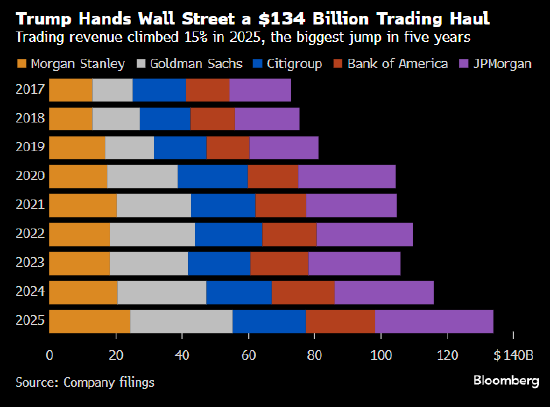 华尔街五大银行公布去年交易收入创下1340亿美元的历史新高,并购活动也呈现上升趋势。Pick及其同行一致认为,这种趋势有望持续下去,尽管一些警示声音也同时存在。